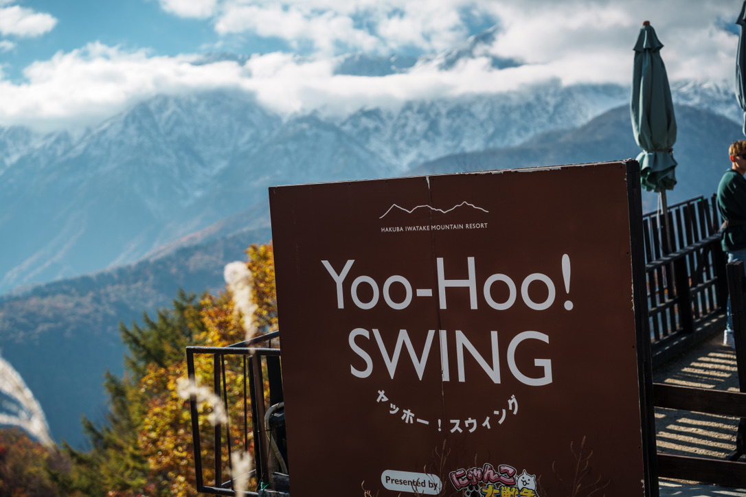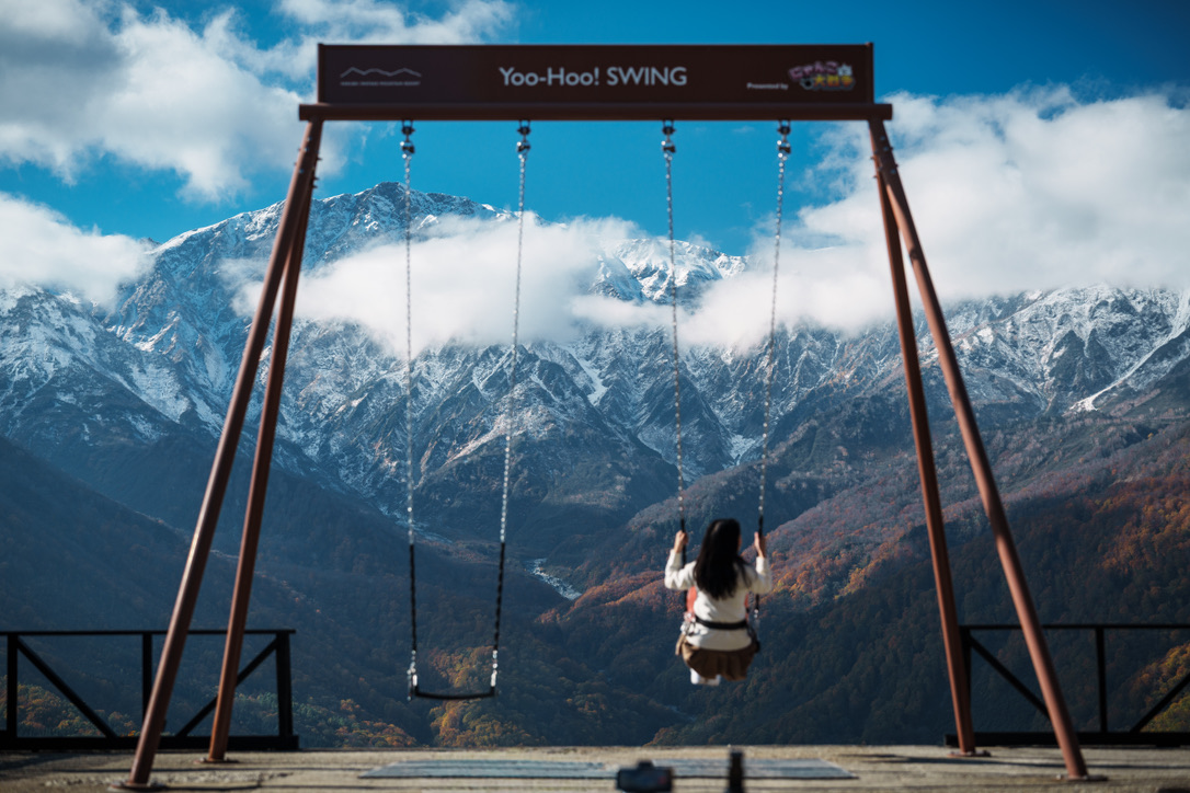 Located at the summit of Hakuba Iwatake Mountain Resort, 1,289 meters above sea level, the Yoo-Hoo! SWING is one of the area’s most popular attractions in both the green and winter seasons. Visitors can enjoy the unique feeling of swinging out toward the Japanese Alps with a full panoramic view of the Hakuba Valley. Each ride costs ¥500 per person, and access to the swing requires either a gondola ticket or a two-hour hike to the top.