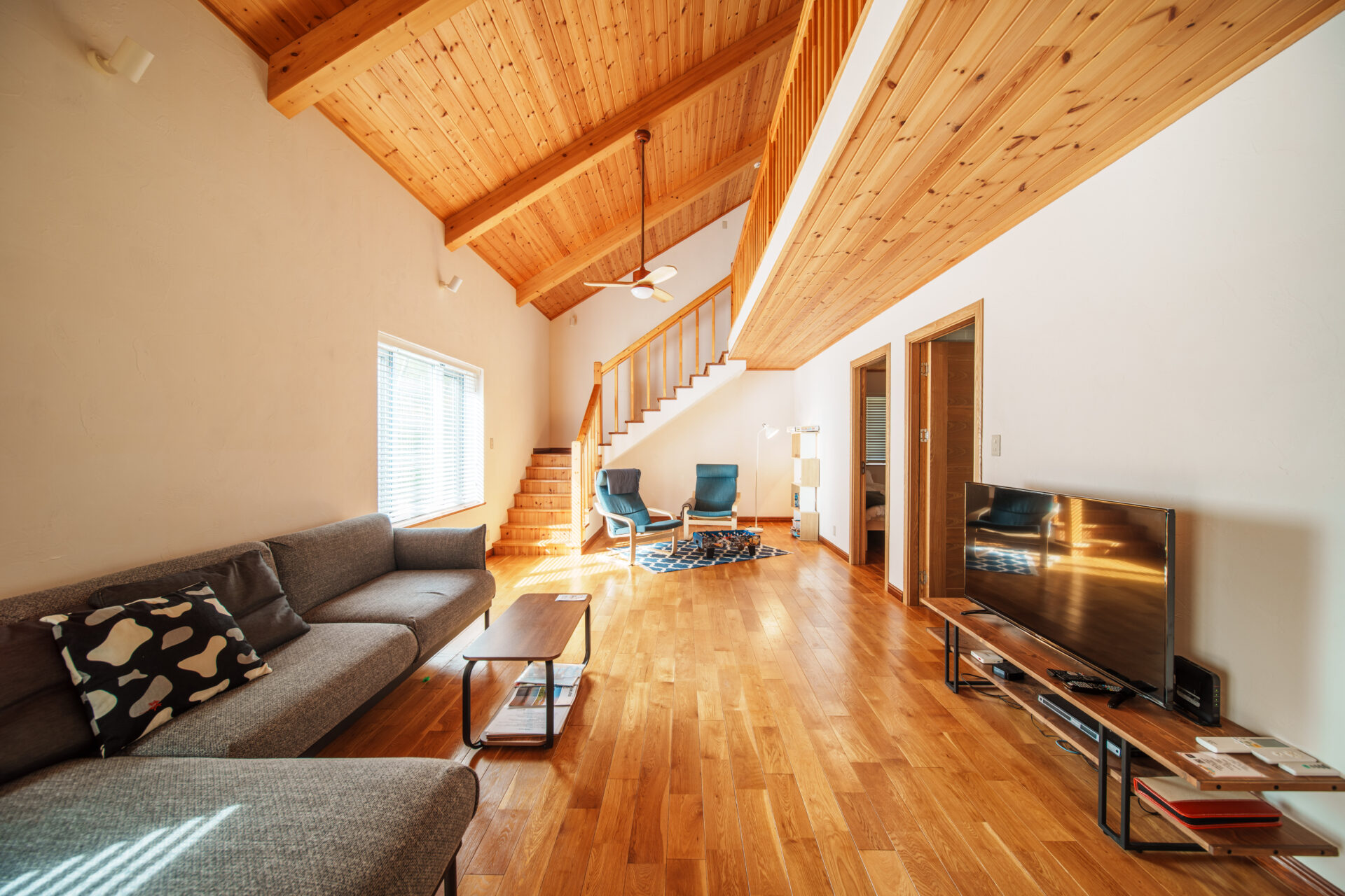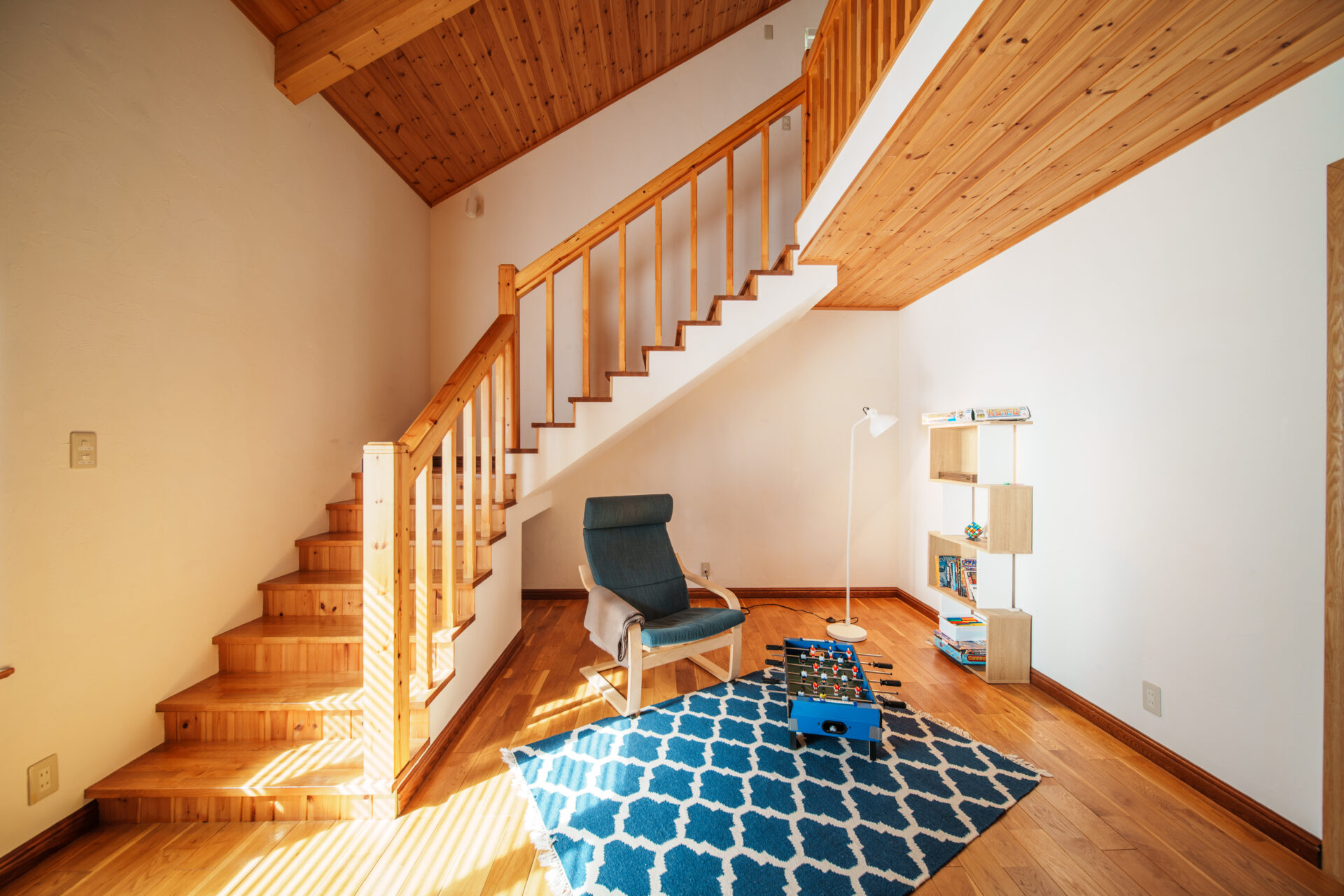 天井が高く開放的なリビングの奥には、子どもたちがボードゲームなどを楽しんだり、のんびり読書を楽しむことのできるリラックススペースがあります。