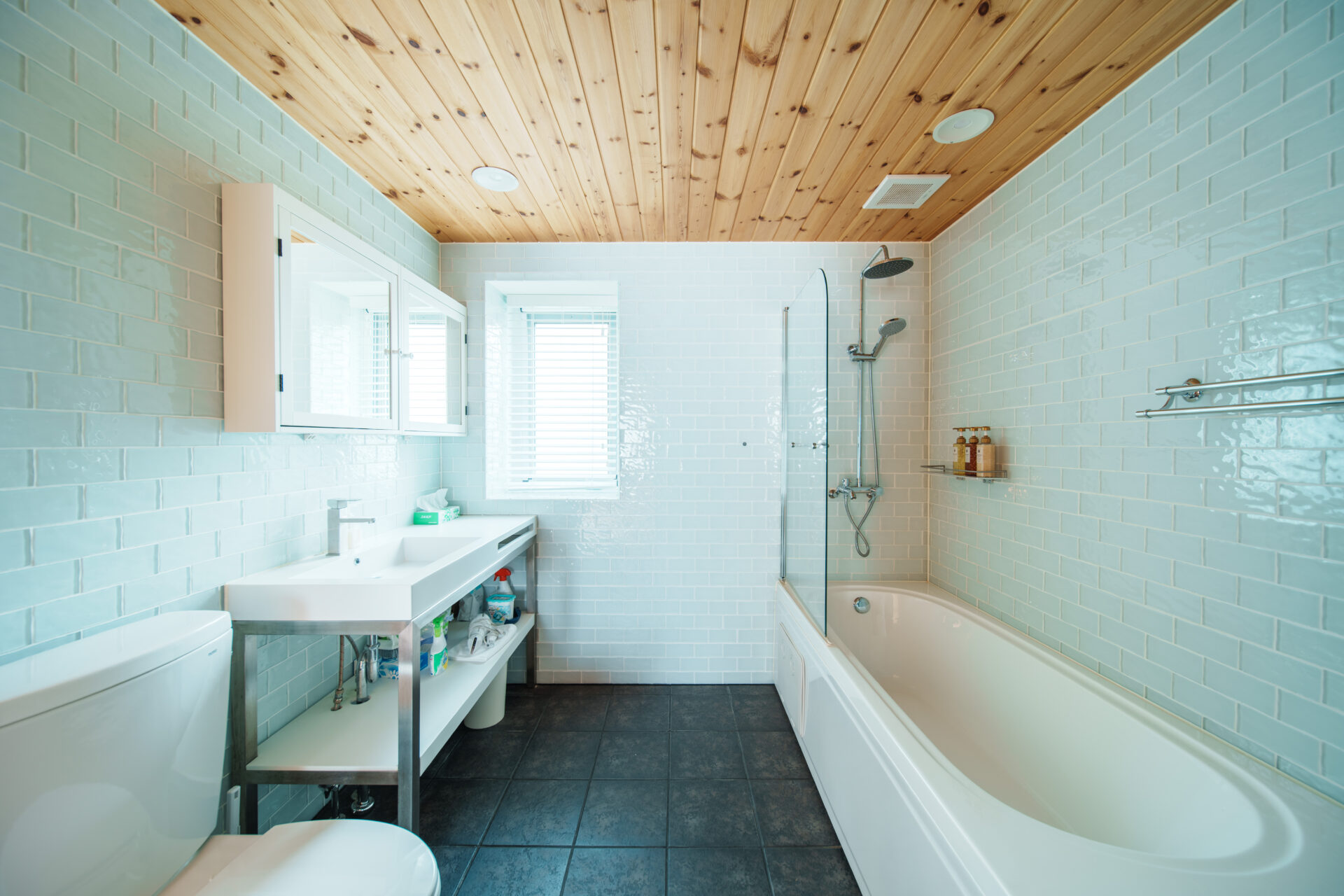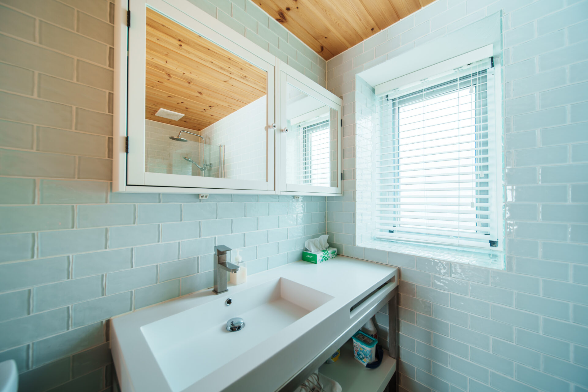 1階にはオシャレなバスルーム、2階にはガラス張りのシャワールーム。