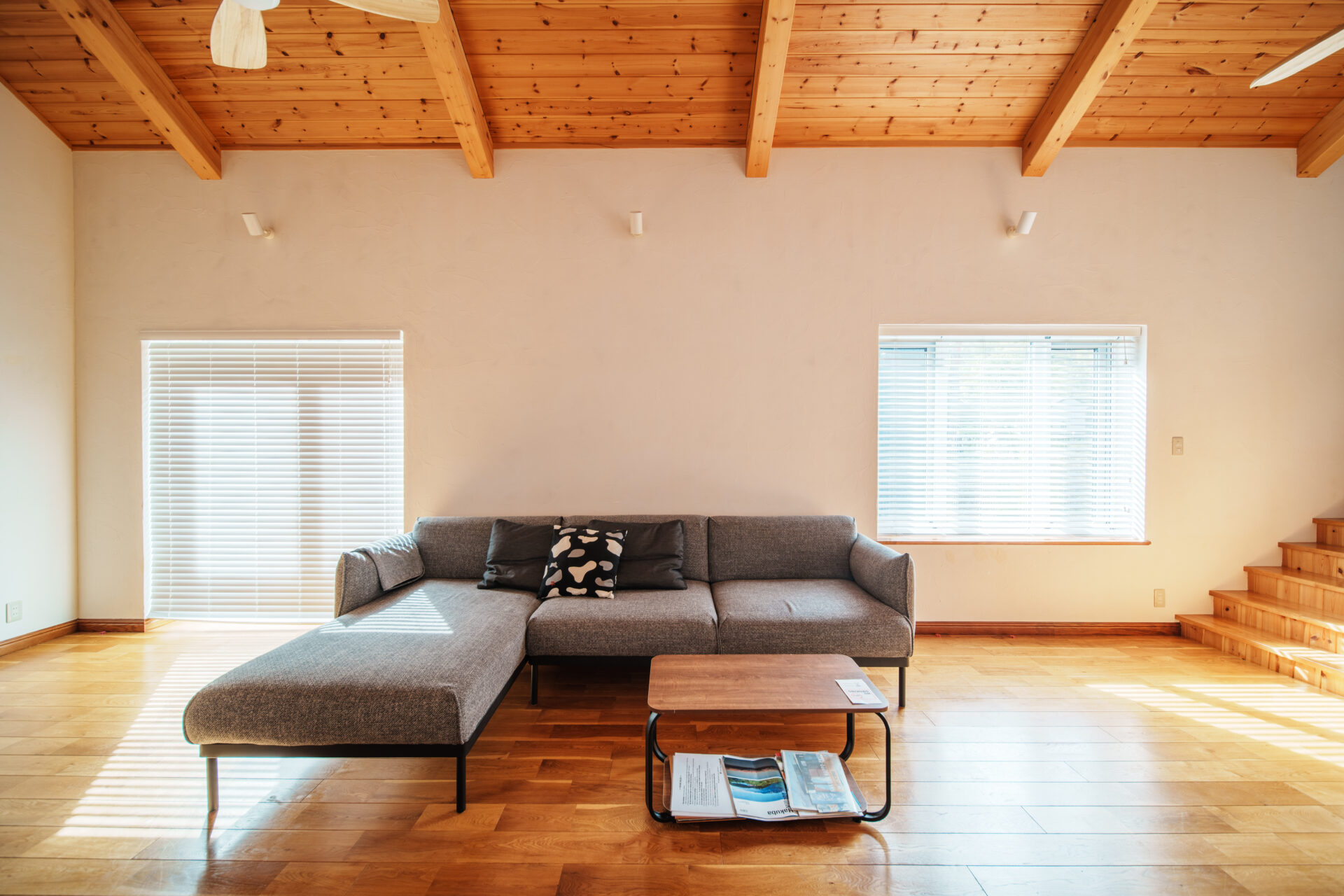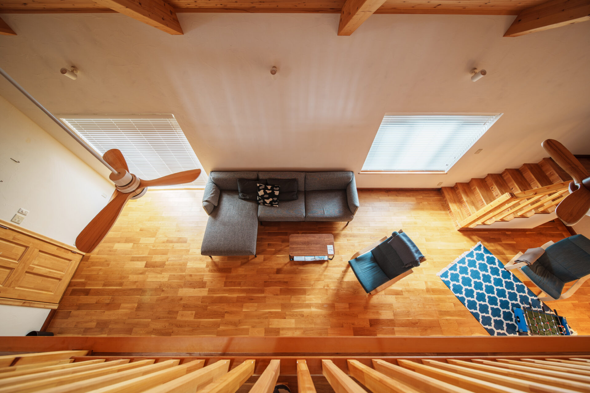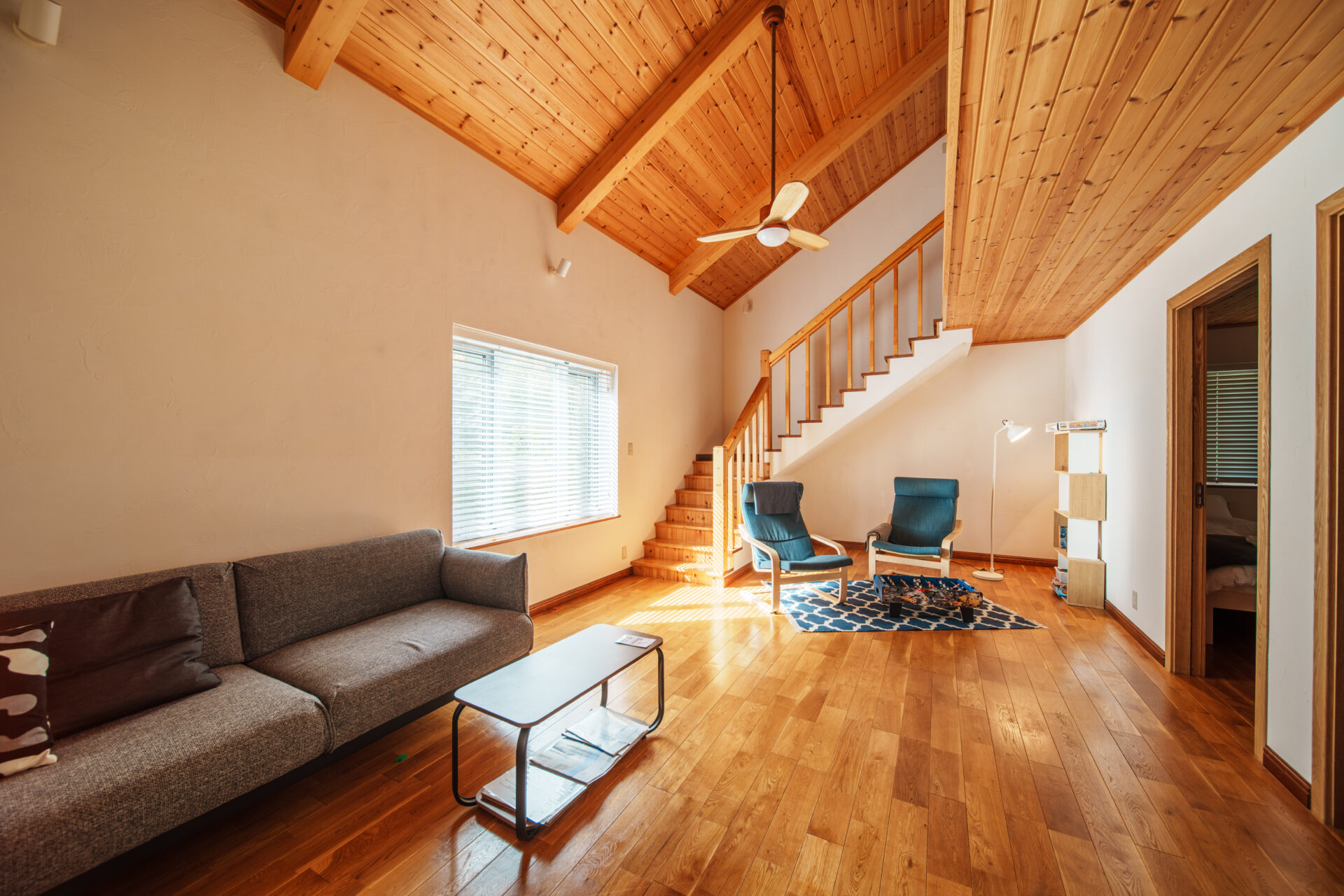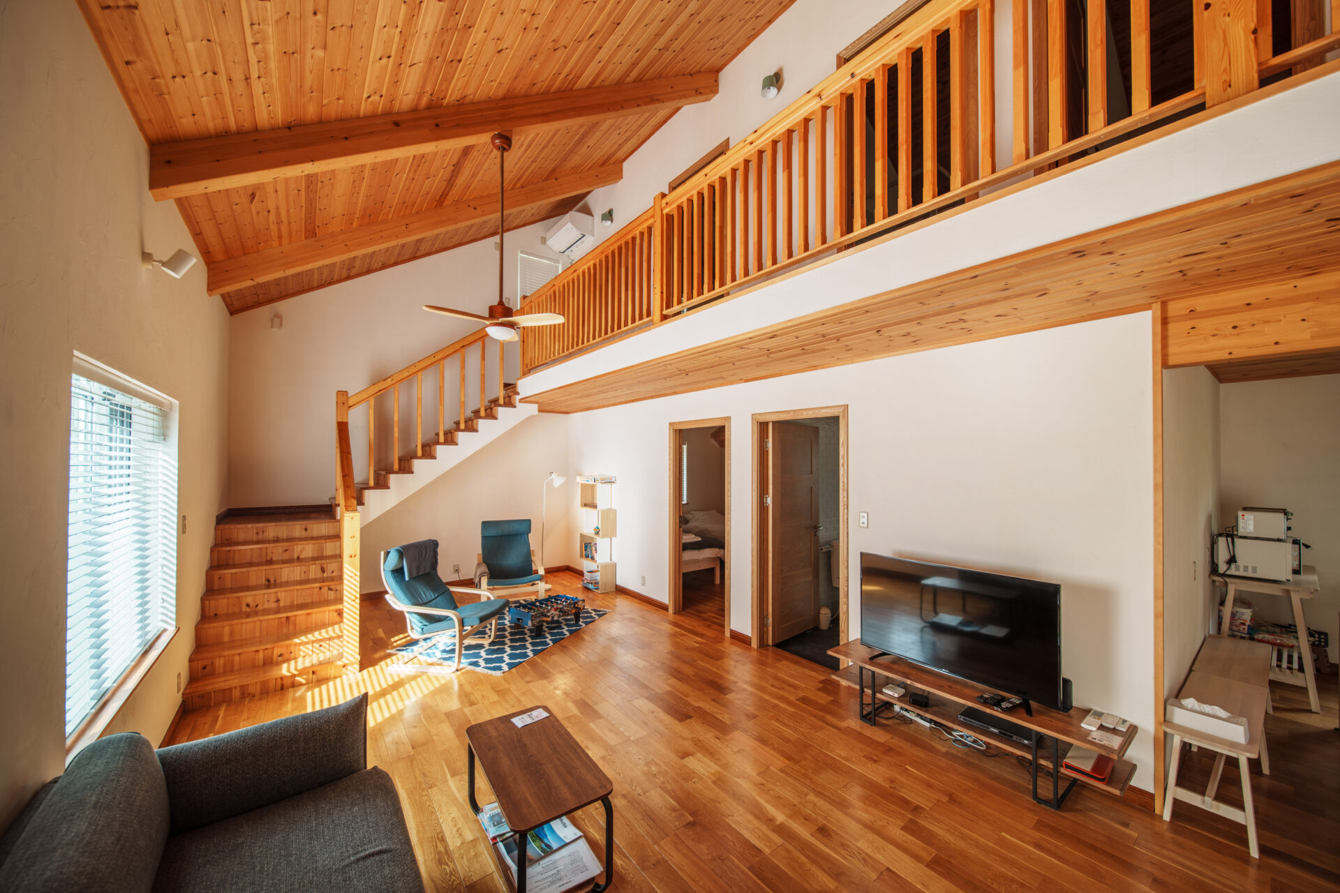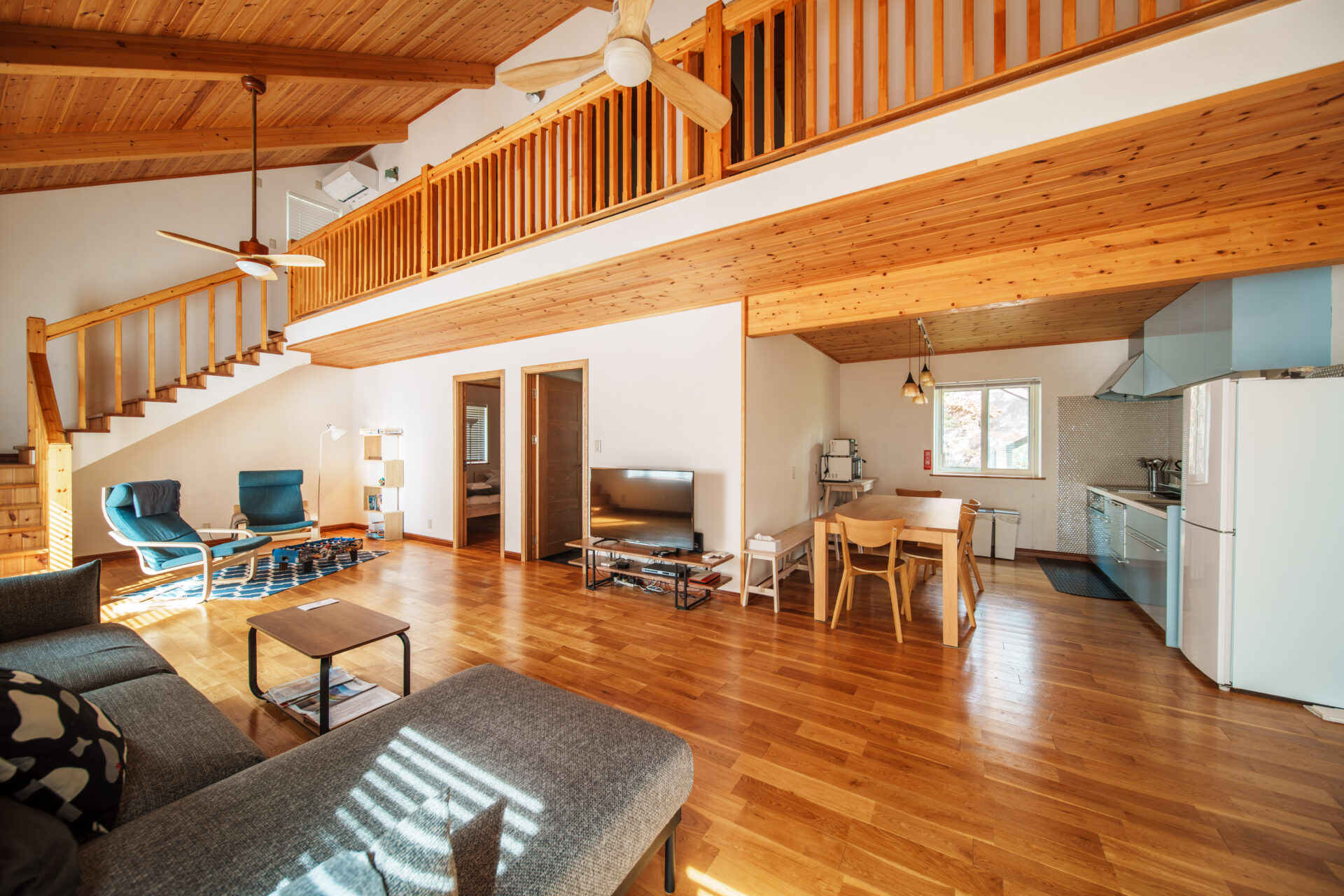 そして夏は、リビングルームから階段で上がった吹き抜けエリアに大きなエアコンが設置されておりますが、各寝室にはエアコンがございませんのでご了承ください(扇風機のご用意はございます)。