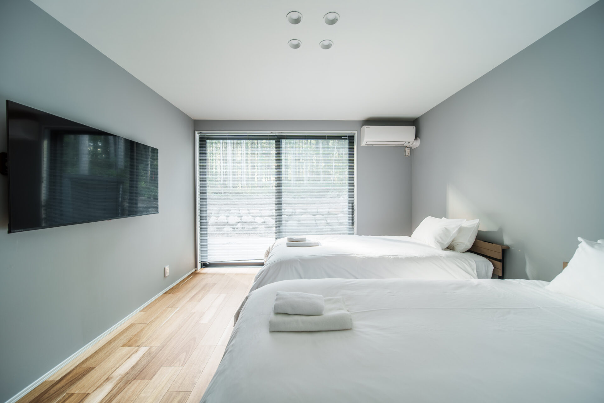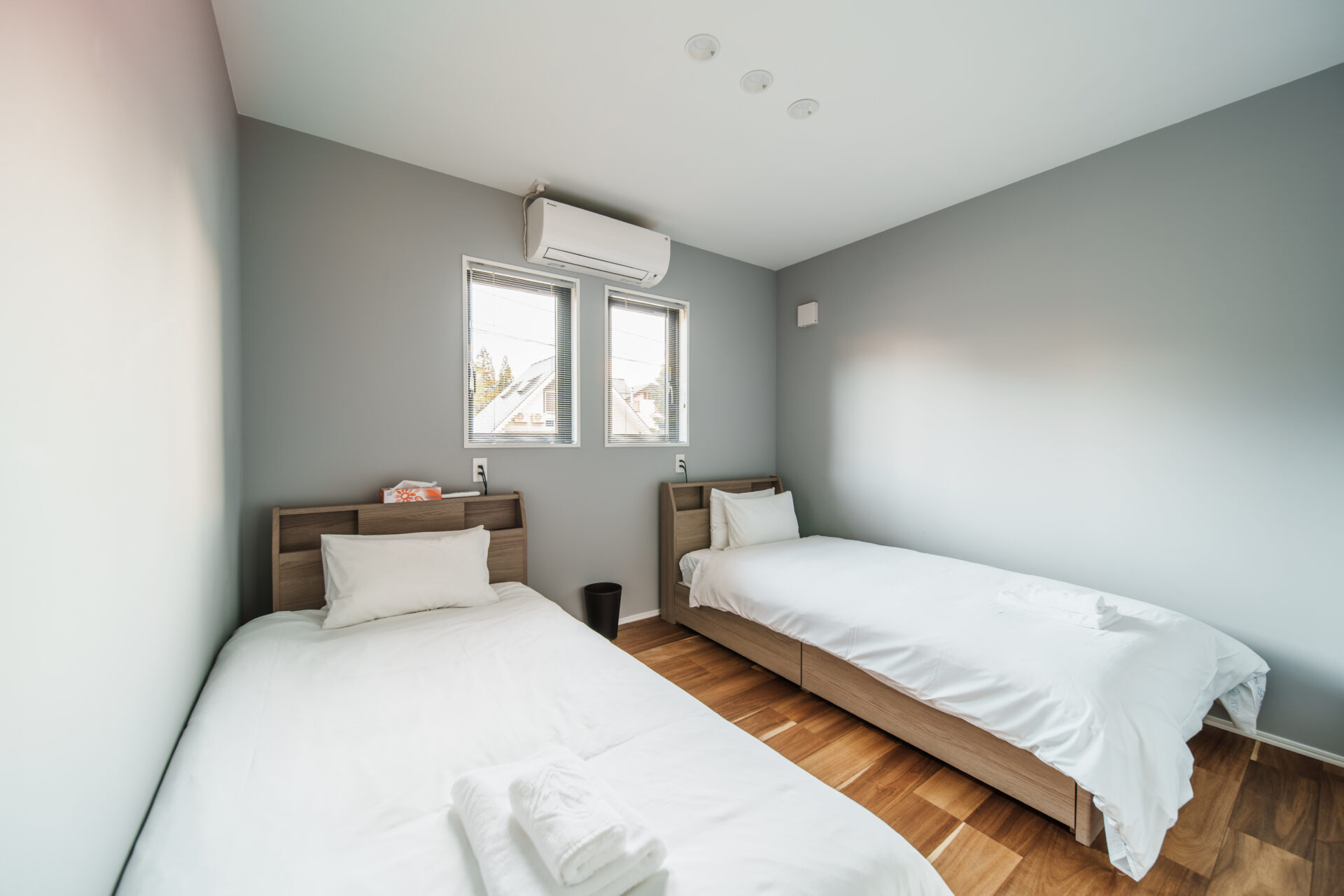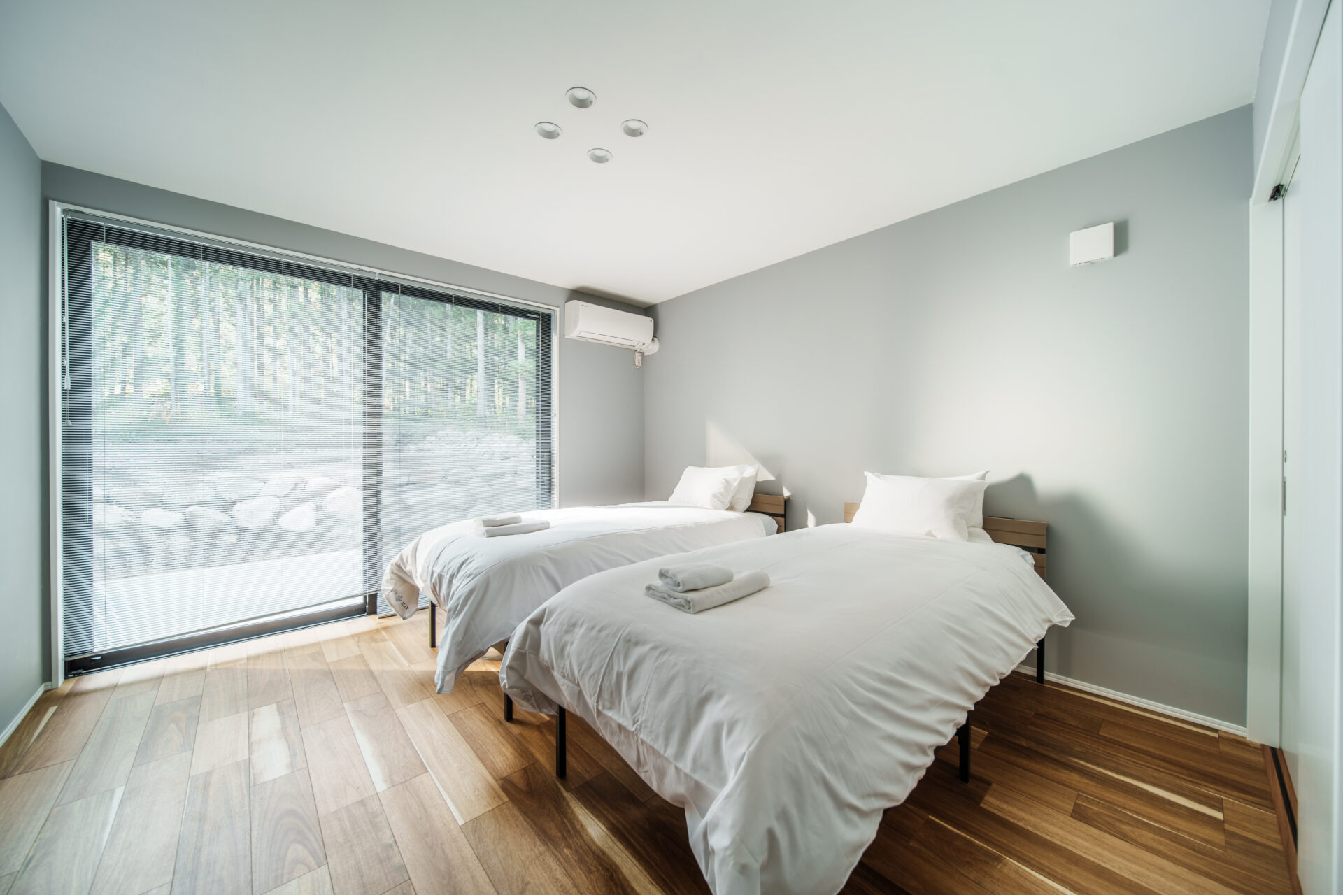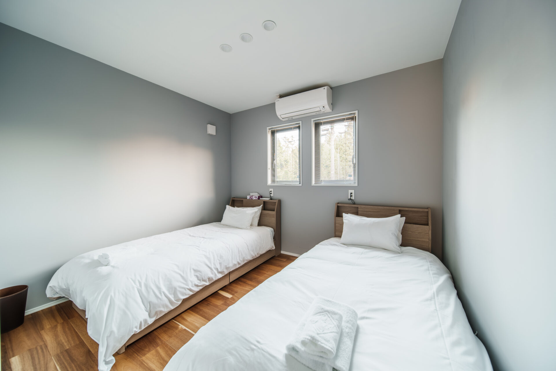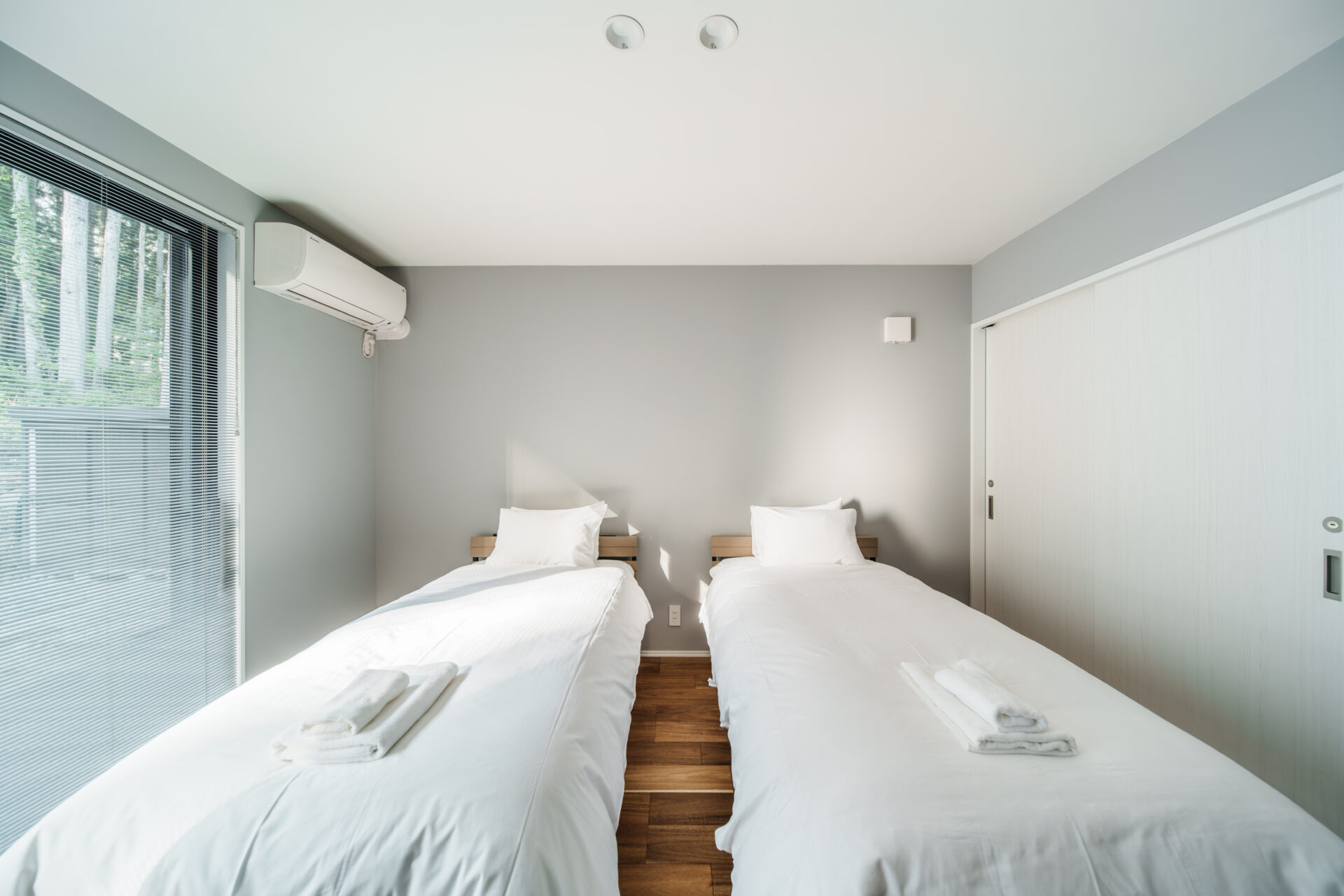 全ての寝室にシングルベッドが2台ずつとありますが、お客様のご要望に応じて、キングベッドとしてご用意することも可能です。